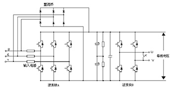 電機產(chǎn)生的能量通過(guò)逆變側的二極管回饋到母線(xiàn)電壓,當直流母線(xiàn)電壓超過(guò)一定的值,整流側能量回饋控制部分啟動(dòng),將直流逆變成交流,通過(guò)控制逆變電壓相位和幅值將能量回饋到電網(wǎng)。